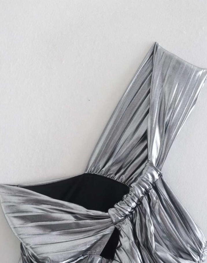 The high street style and solid color design make it both versatile and stylish, while the sleeveless design and skew collar add a touch of sophistication. The knotted bow decoration provides a unique and eye-catching touch, making this top a great choice for a night out on the town. The blouse is made from a blend of acetate, rayon, and nylon, making it durable and comfortable. The pullover design ensures easy and convenient wear, making this top a great choice for any busy woman on-the-go. So put on your Priscilla Metallic Knotted Top and get ready to turn heads wherever you go!